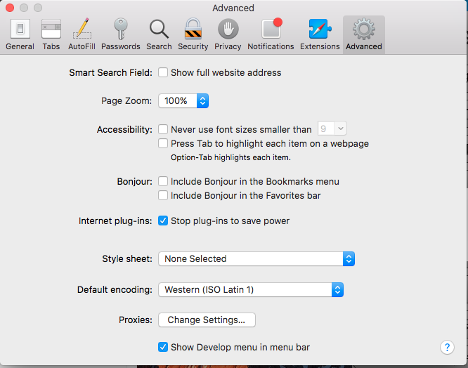 - Safari -> Preferences -> Advanced 勾选 Show Develop menu in menu bar;